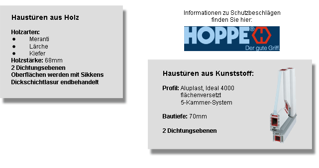 | Wir planen Haustüren aus Holz und Kunststoff frei nach Ihren Wünschen. Wem es an eigenen Ideen mangelt, dem werden wir verschiedene Gestaltungsmöglichkeiten unterbreiten.
