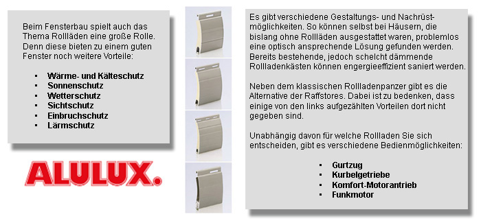 Ein Aufbaurollladen sitzt auf dem Fenster. Das heißt, es muss bereits bei der Fensterfertigung mit eingeplant werden, oder über einem bestehenden Fenster eine Öffnung geschaffen werden. So macht diese Variante nur in Verbindung eines neuen Fensters Sinn. Vor allem bei Altbauten, bei denen keine Unterputz-Rollladenkästen vorhanden sind. Man erhält den aus Kunststoff gefertigten Rollladenkasten in allen gängigen RAL-Tönen oder kann sich für die Variante entscheiden, bei der er ein- oder beidseitig überputzt werden kann. Man muss bei dieser Variante allerdings beachten, dass bei einen Fensteraustausch der Rollladenkasten mit entfernt wird. Dieses wirkt sich auf die Fassadengestaltung aus. Der Putz muss anschließend erneuert werden.